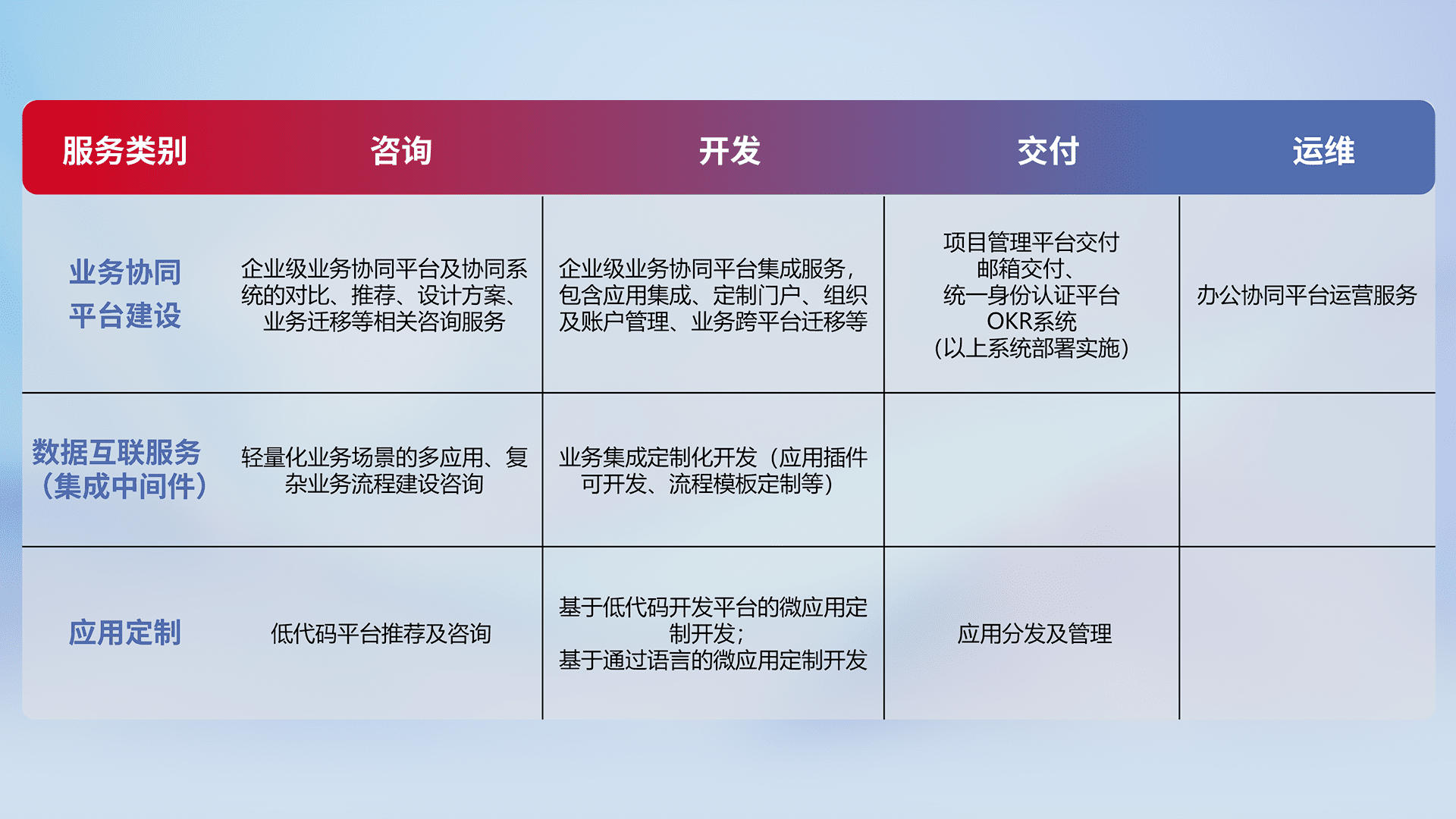 针对钉钉、、企微、、、IDaas等平台级产品提供产品的规划、、方案、、、交付、、、定制化开发等服务,,,实现如统一协同办公、、、、智能客户服务、、、混合会议管理、、智能数据查询、、、等业务场景,,实现数字化转型。。。